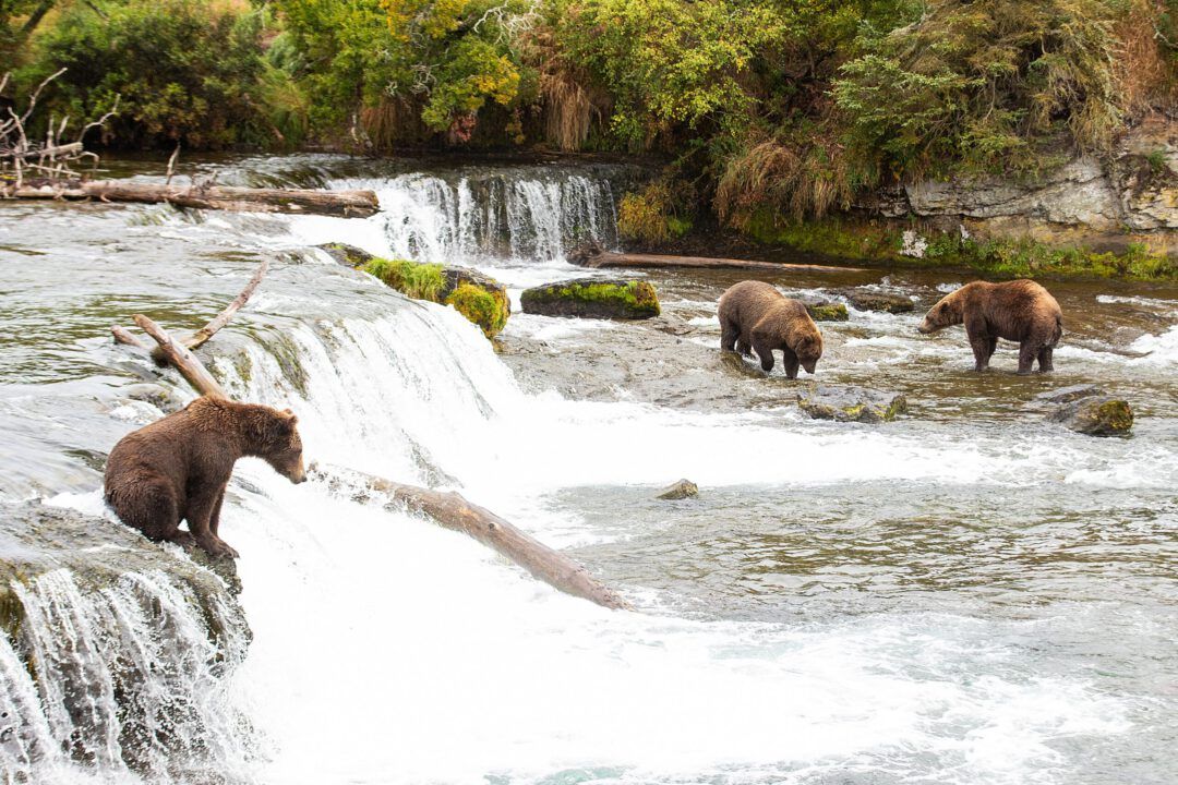 - Brooks Falls: Dit iconisch gebied staat bekend om de spectaculaire zalmvisserij van bruine beren. Het is een van de beste plaatsen ter wereld om deze majestueuze dieren te zien vissen terwijl ze de watervallen beklimmen.